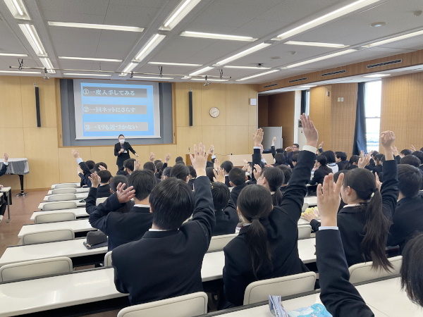 八幡東警察署の警察官の方からも、具体的な事例をお聞きすることができました。安易な誘いや怪しいDMの危険性をよく理解し、教えていただいた「3つの勇気」(ルールを守る勇気、断る勇気、SOSを出す勇気)をもって、明るい未来につながるように過ごしていきたいものです。