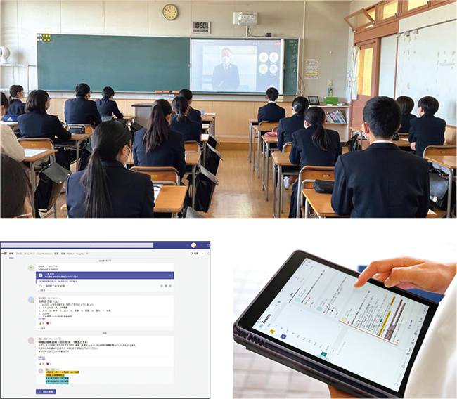 Microsoft 365を導入し、Teamsを使った連絡や行事·授業の配信、メール、動画の視聴など、日々の生活の様々な場面で活用しています。チャット機能で個別の相談·質問なども行っています。