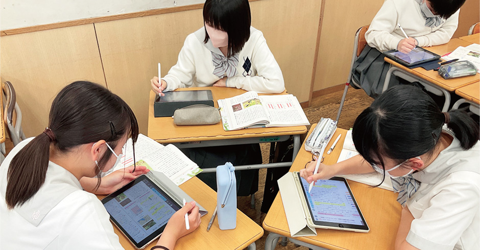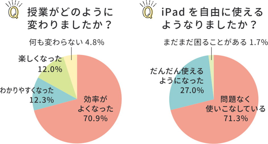 多くの生徒が、iPadによって授業が変わったことを実感しています。また、ほぼ全員の生徒が授業中に自由に操作できています。
