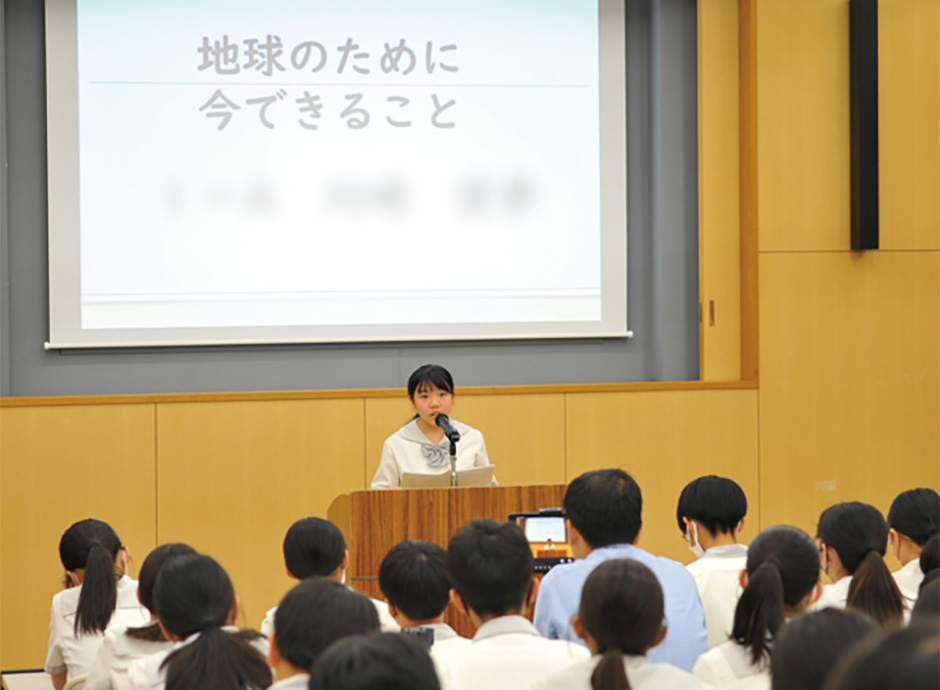 世の中のために自分が何ができるかを考える「Final stage」(3年生)と、それぞれの学年でテーマを設定し、作文にして発表したり、レポートにまとめたりします。