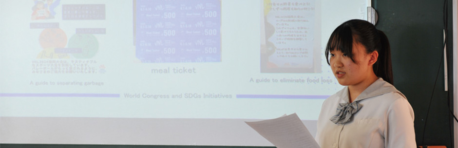 世の中について学んだことをもとに、国際社会の一員として、自分は何ができるか・どのようなことに貢献できるかをまとめ、みんなの前で英語を使って発表します。